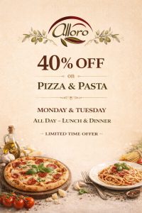 Our pizzas are freshly made in traditional clay oven (Il Forno) in front of you. We also have an Italian themed bar where you can relax and unwind with an Apéritif before your meal. Alloro has a simple Italian way of dinning in a warm rustic ambience. So be it a small light lunch or an evening meal, it is a cosy place whatever the occasion. Our motto is ‘Eat Drink Share’ which refers to the Italian way of dining.